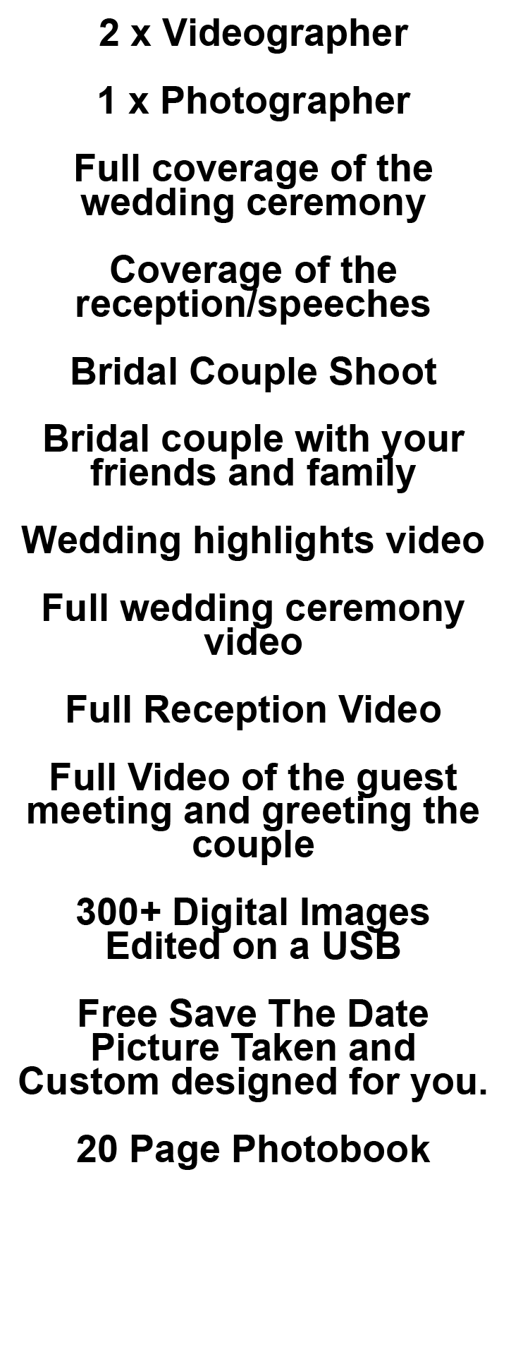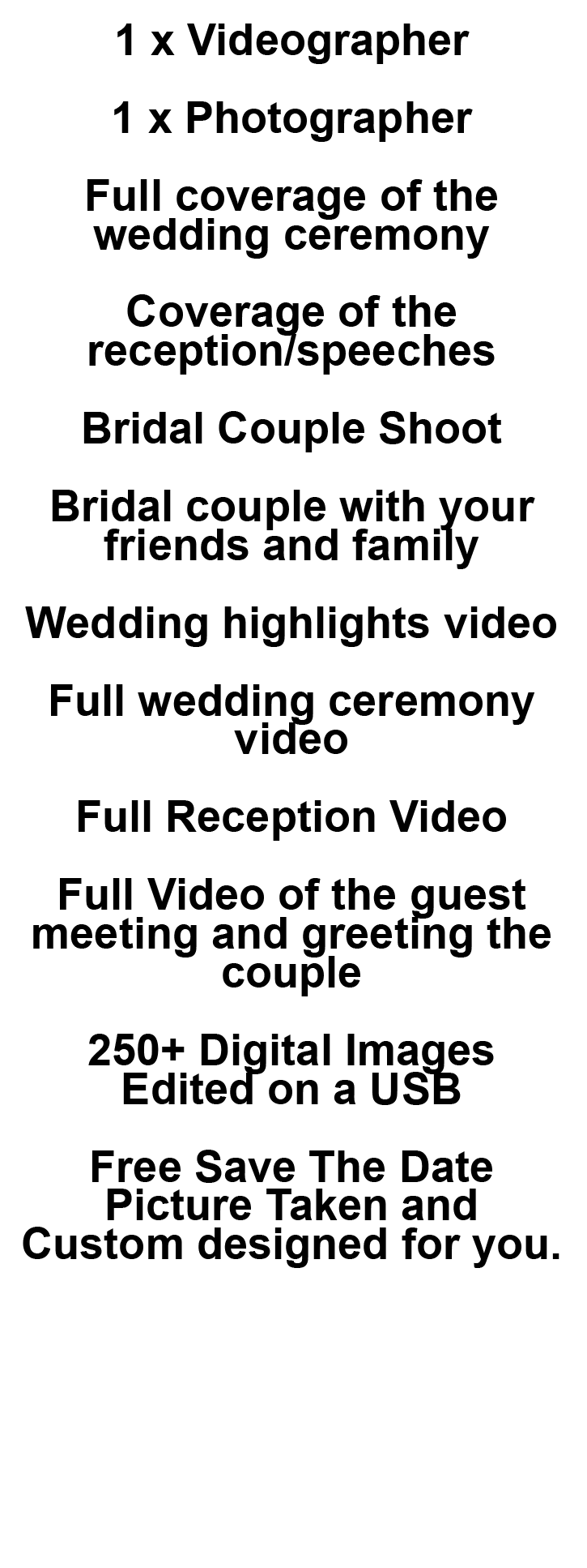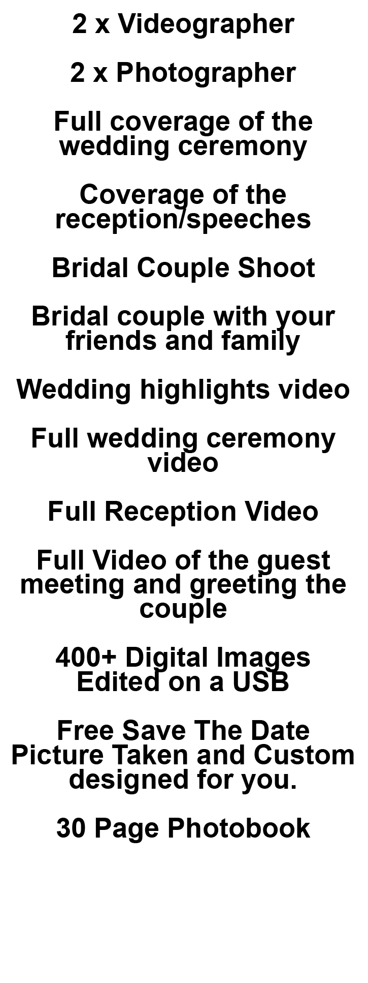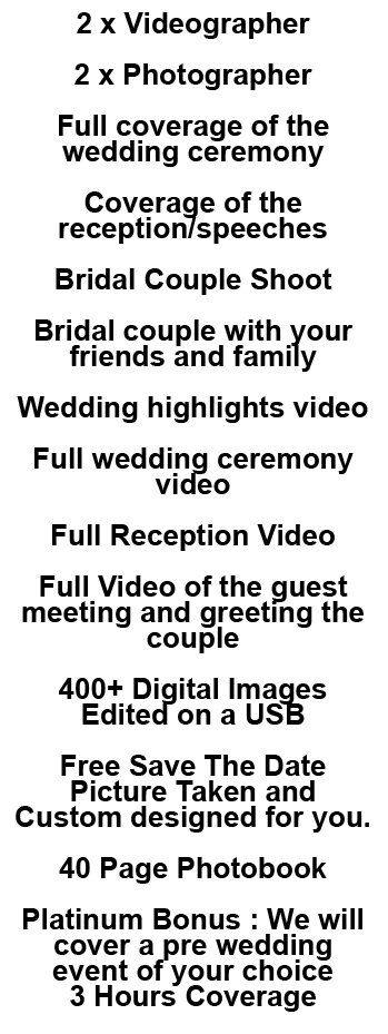 As no two Weddings are the same, all our packages are fully customisable and we will tailor make it to suit your budget, below is a few of our most common packages on offer, Please contact us for more info